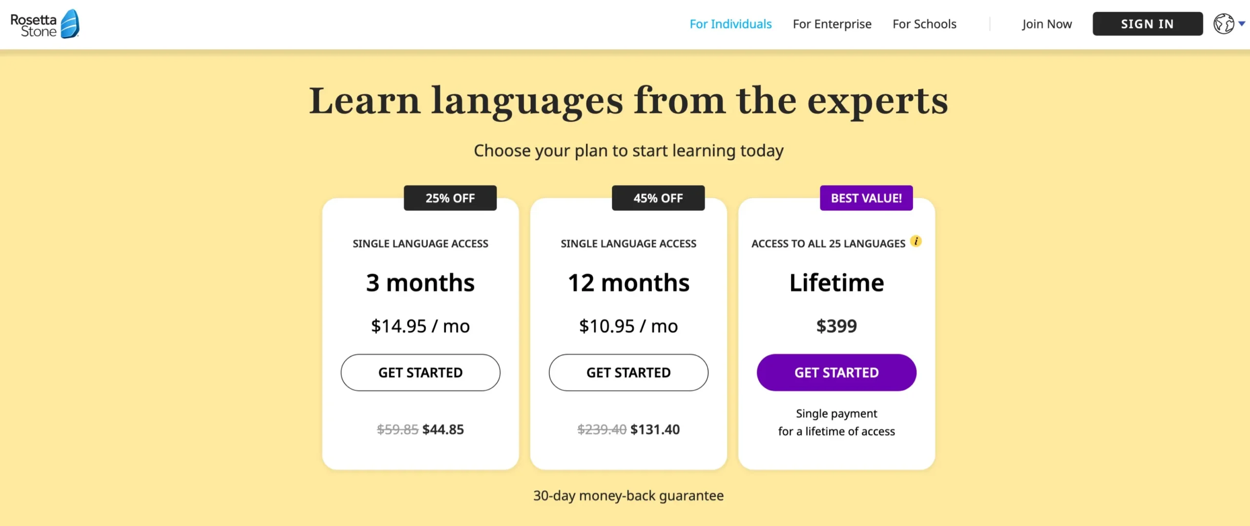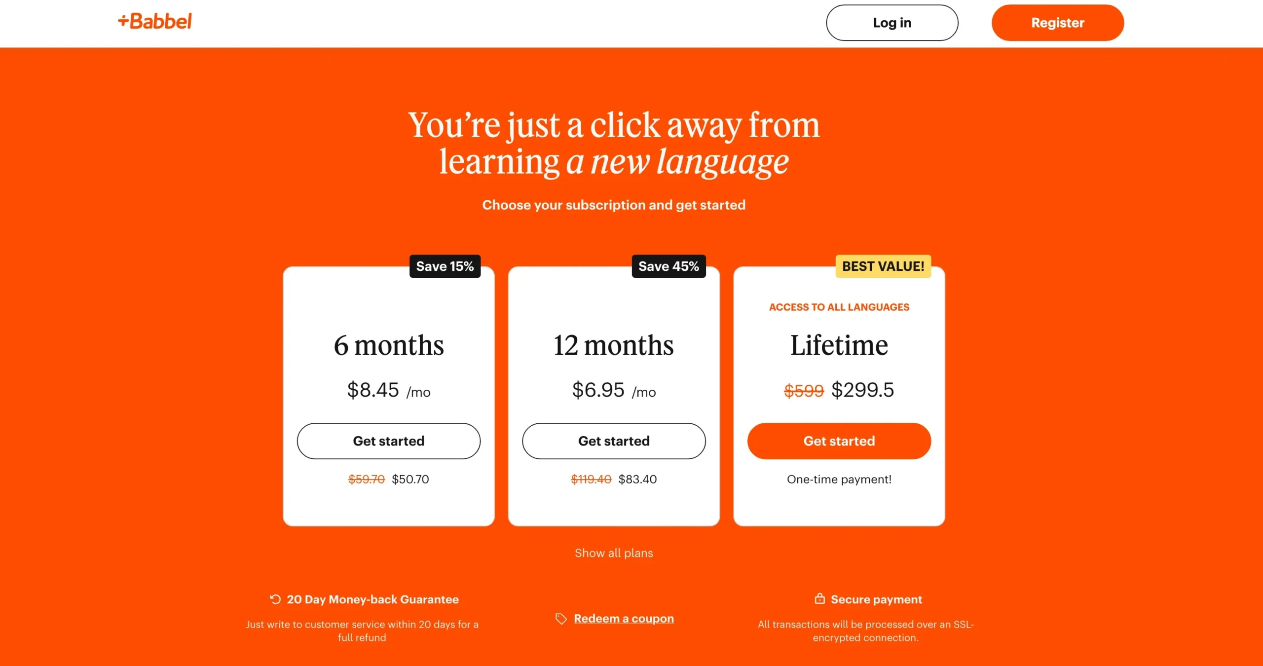 Babbel costs $8.45/month (6-month plan) or $299.50 for lifetime access, while Rosetta Stone costs $10.95/month (12-month plan) or $399 for lifetime access.