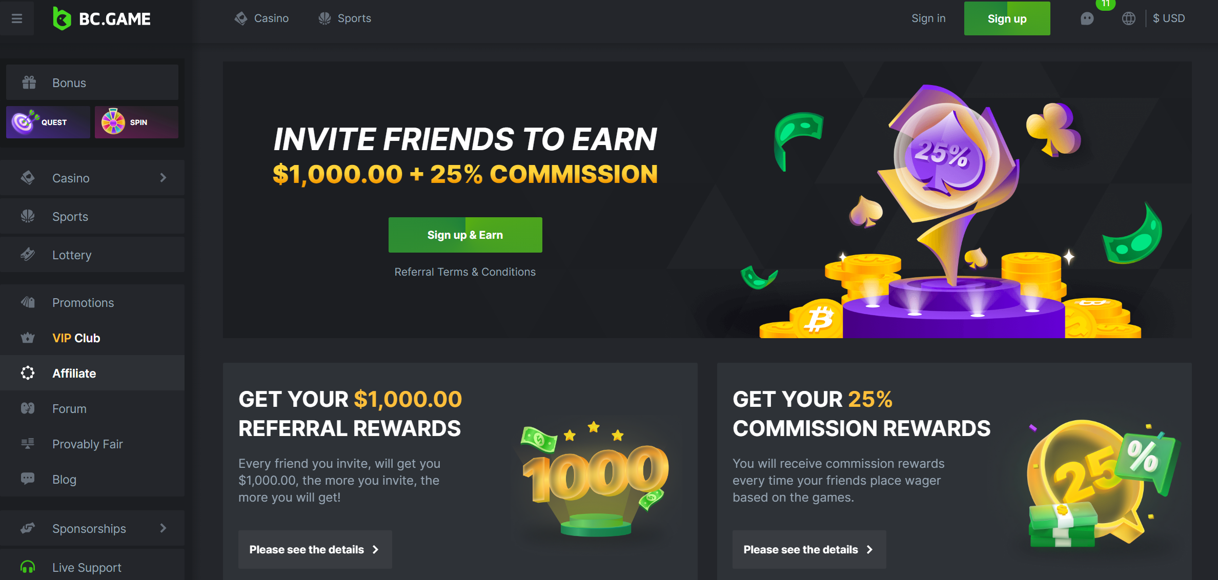 Affiliates in the BC Game partner program, which is on the SoftSwiss platform, have various monetization options, including revenue share, CPA, and hybrid.
