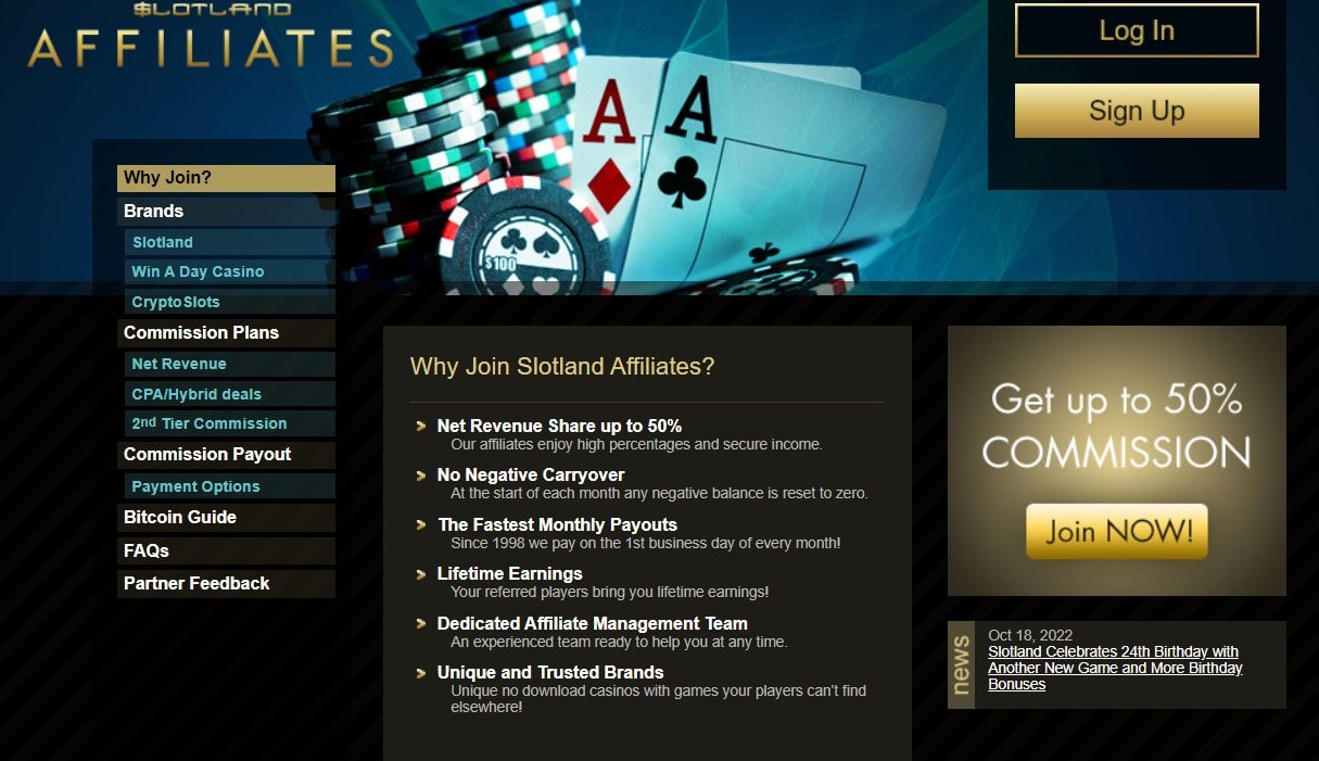 | Slotland Casino | Long-running online casino specializing in slots. | 50% of recurring sales | Lifetime | No | Crypto, check, player account |