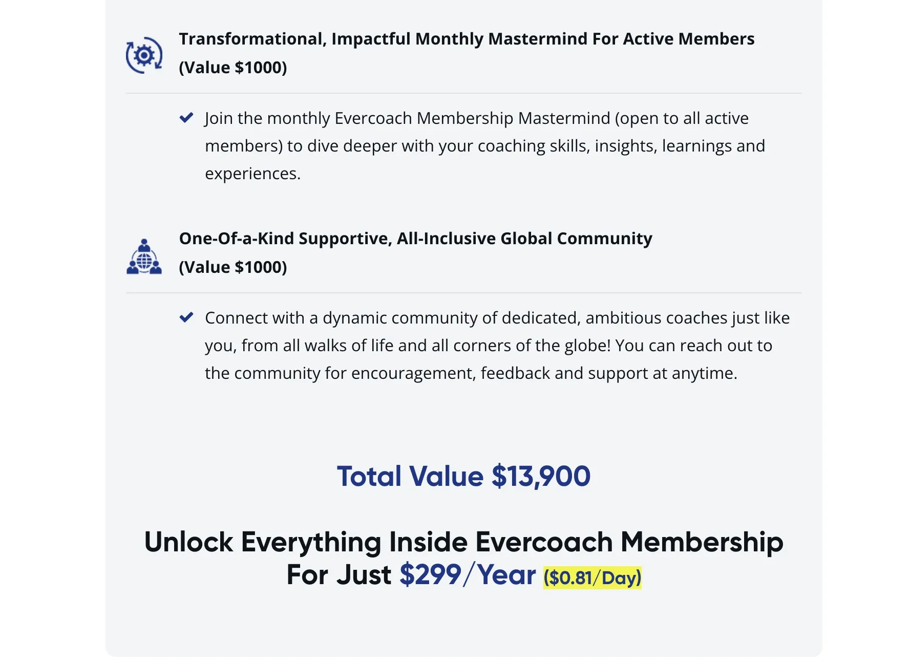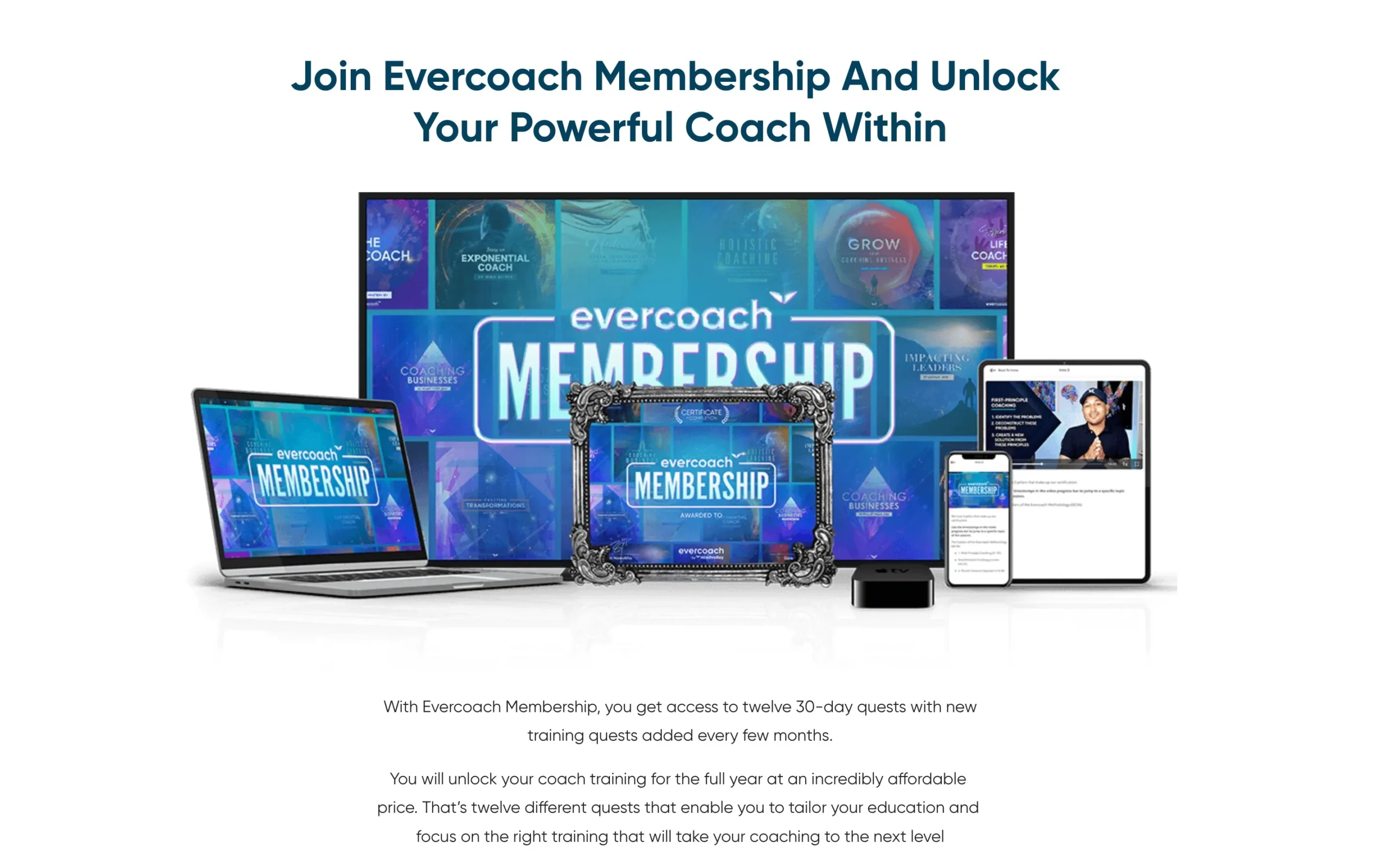 Evercoach Membership is a subscription-based coaching program designed to give you access to top-tier coaching education, business strategies, and an exclusive community.