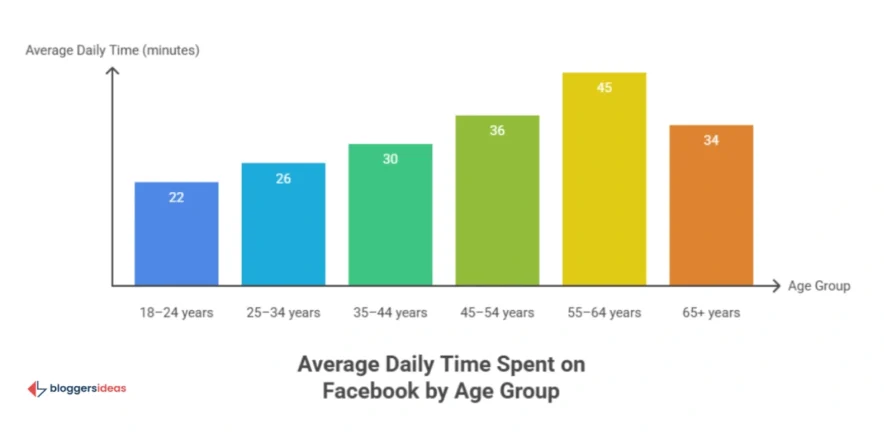 Users spend an average of 10 minutes and 12 seconds per session, totaling 20 minutes daily in the US. The 55-64 age group spends the most time at 45 minutes daily, while 18-24-year-olds spend 22 minutes.