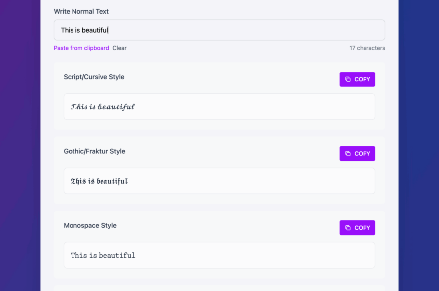 No design or technical skills required. Input your text and get stylish, fancy text instantly.