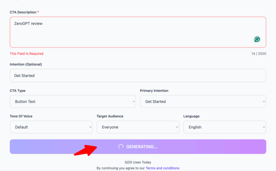 There are so many times when you know you have written the perfect piece. You know your audience is already on the hook. All that is left is to reel them in. What will be the perfect sentence? We present to you a tool you always needed but never knew how much till this moment. Gone are the hours spent staring down your screen and squeezing all creative juices you can muster. The CTA Generator is a magical tool powered by AI to take the stress out of crafting compelling CTAs. It leaves you more time to chill out while your conversion rates soar.