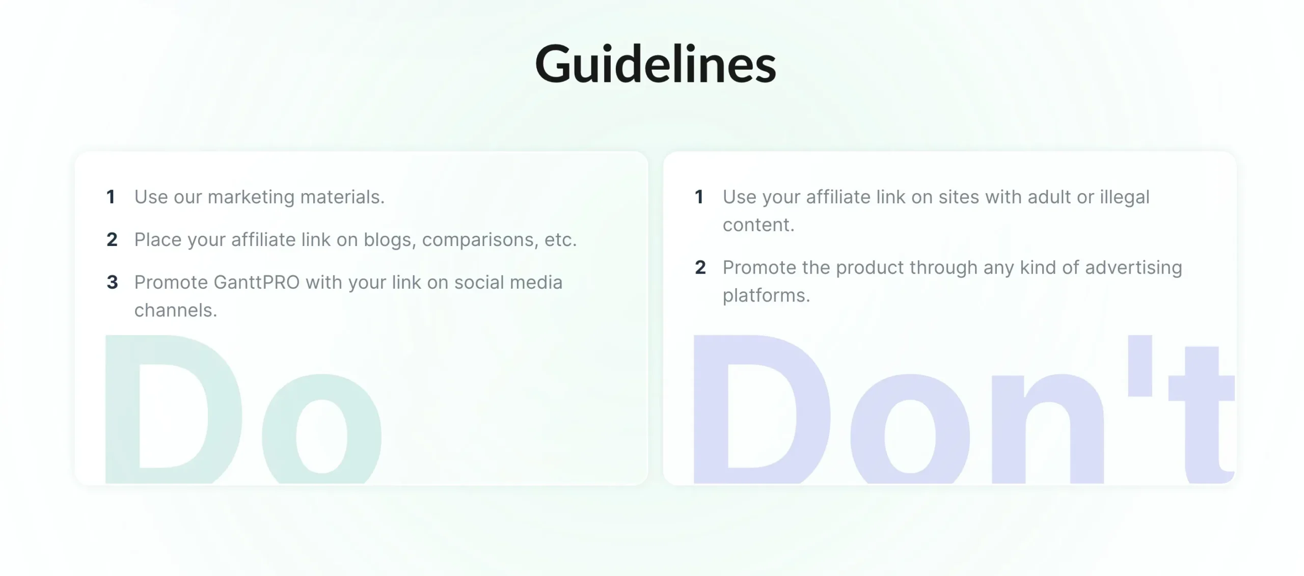 - Avoid Inappropriate Content: Do not place your affiliate link on websites that feature adult content or engage in illegal activities. It’s important to maintain the integrity and reputation of both you and GanttPRO.