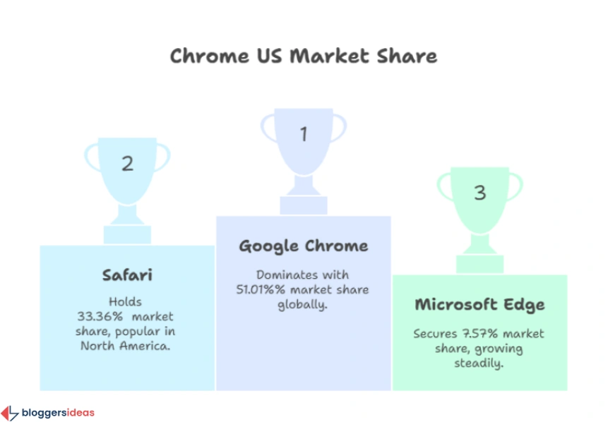 In the United States, Chrome holds an impressive 51.01% share of the browser market, making it the leading browser despite stronger competition.
