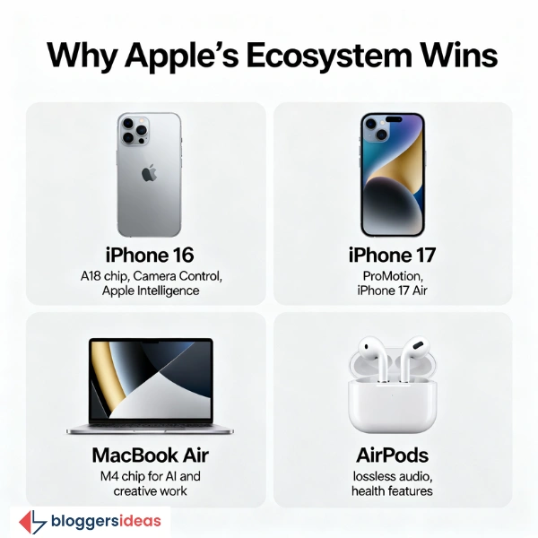 The iPhone 16’s 4K 120fps video, MacBook’s M4 efficiency, and AirPods’ Spatial Audio create a cohesive experience that Android, Windows, and rival earbuds struggle to match.