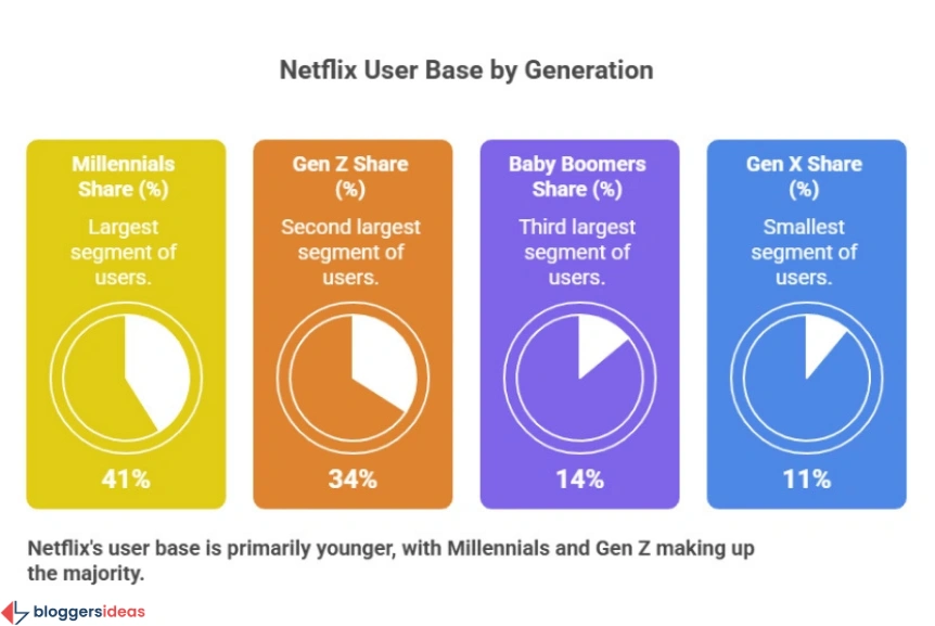 Millennials represent the largest share of Netflix users, closely followed by Generation Z, indicating the platform’s strong connection with younger audiences.
