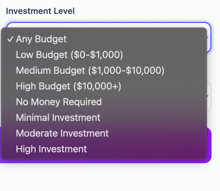 Select the type of niche you’re seeking: Trending, Evergreen, Micro-Niche, High-Profit, or Audience-Specific. And also the budget so that the idea is given accordingly.