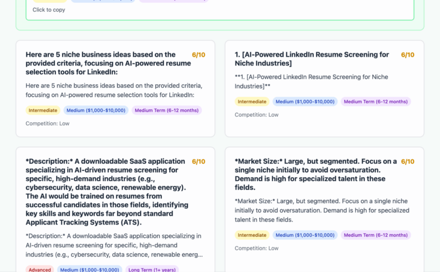 Our AI analyzes market demand, competition, and trends to generate niche ideas that balance opportunity with feasibility.