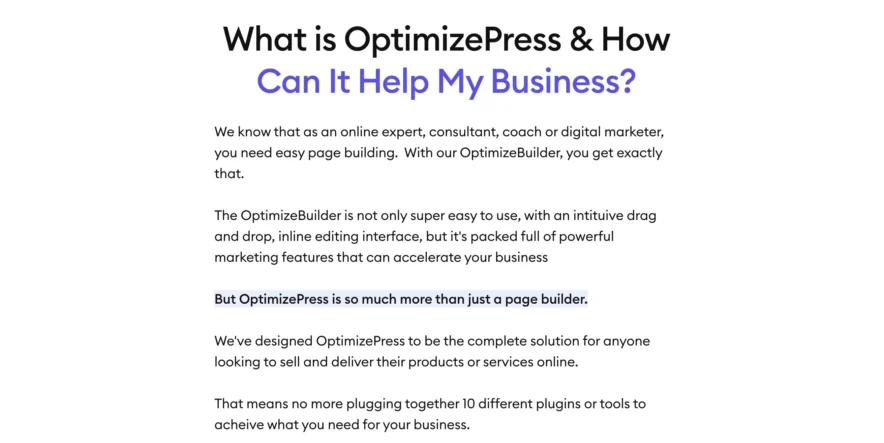 OptimizePress is a powerful WordPress page builder designed to help businesses create landing pages, sales funnels, and marketing pages without complex coding.