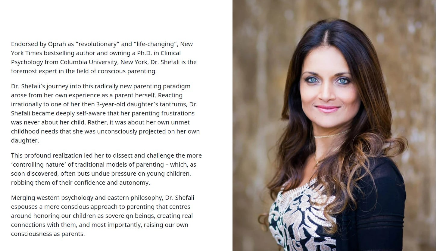 A clinical psychologist who lives in New York City, USA, Shefali, as she seems to be universally known, was born in Mumbai, India but studied psychology in New York City (and is known as Dr. Shefali).