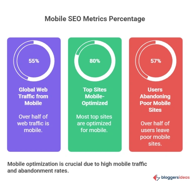 Mobile optimization impacts SEO performance in 2025 by catering to 55% of global web traffic, reducing bounce rates, and improving user experience, as 57% of users avoid poorly optimized mobile sites, boosting rankings.