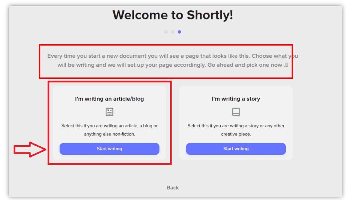 When you open a new document, you’ll be presented with two options, “I’m writing an article/blog” and “I’m writing an article/blog.” I’ve chosen the first option.