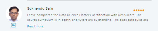 I have completed the Data Science Masters Certification with Simplilearn. The course curriculum is in-depth, and tutors are outstanding. The class schedules are.