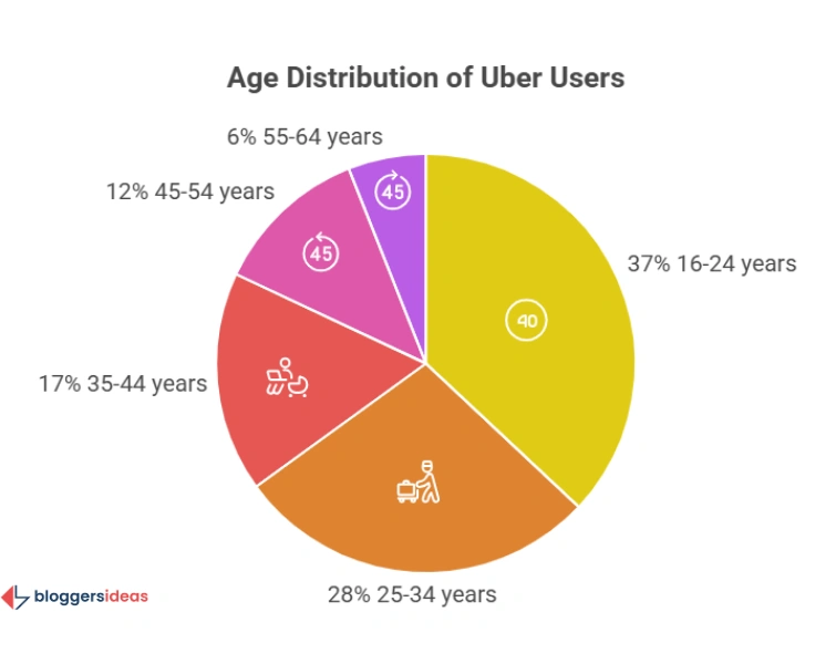 Uber users are nearly evenly split by gender — 52% men and 48% women. Younger users dominate, with 37% aged 16–24 and 28% aged 25–34.