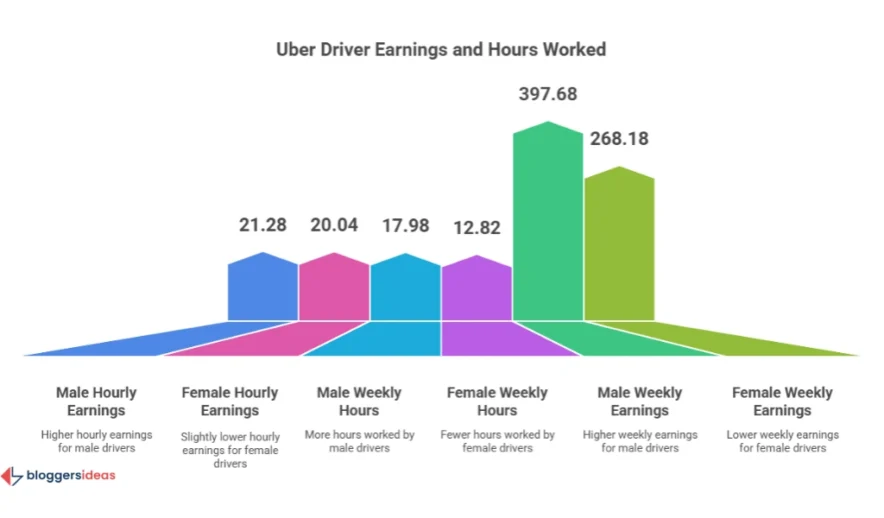 Male Uber drivers, on average, earn $21.28 per hour and approximately $397.68 weekly, while female Uber drivers average $20.04 per hour and $268.18 weekly, reflecting differences primarily in the hours they choose to work.