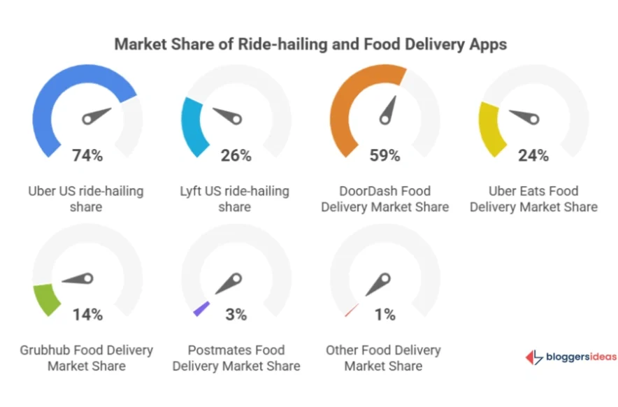 Uber commands 74% of the U.S. ride-hailing market, far ahead of Lyft (26%). In food delivery, Uber Eats holds 24%, second only to DoorDash (59%).
