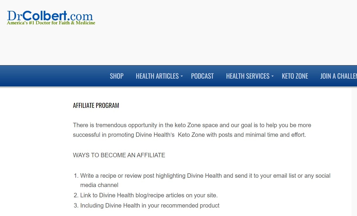 Dr. Colbert offers a variety of “Keto Zone” weight reduction pills and products in addition to his book. This affiliate program offers a commission rate of 10 percent and an average order value of $ 135.71.