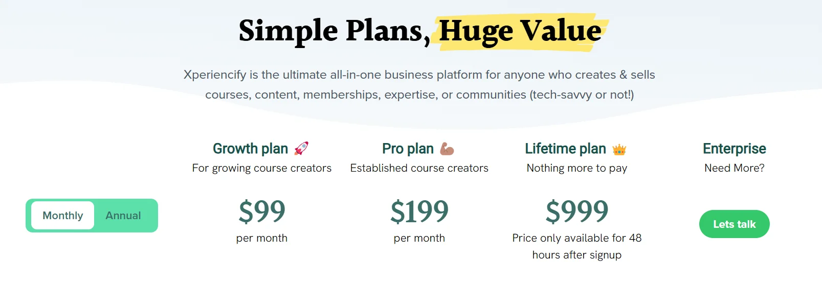 Go with Xperiencify if you’re an ambitious course creator looking to maximize student engagement and you’re ready for a premium price for powerful features. Its plans are designed for creators aiming to create courses that stand out with a unique experience.