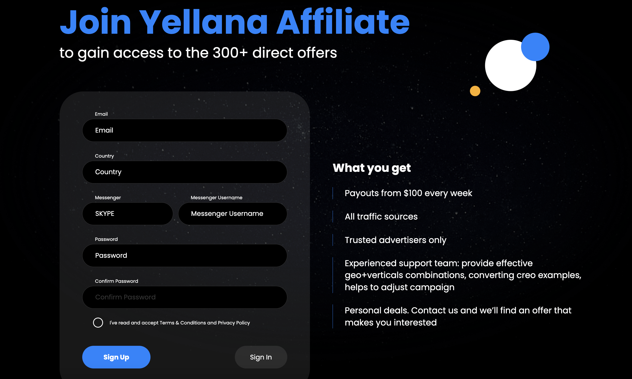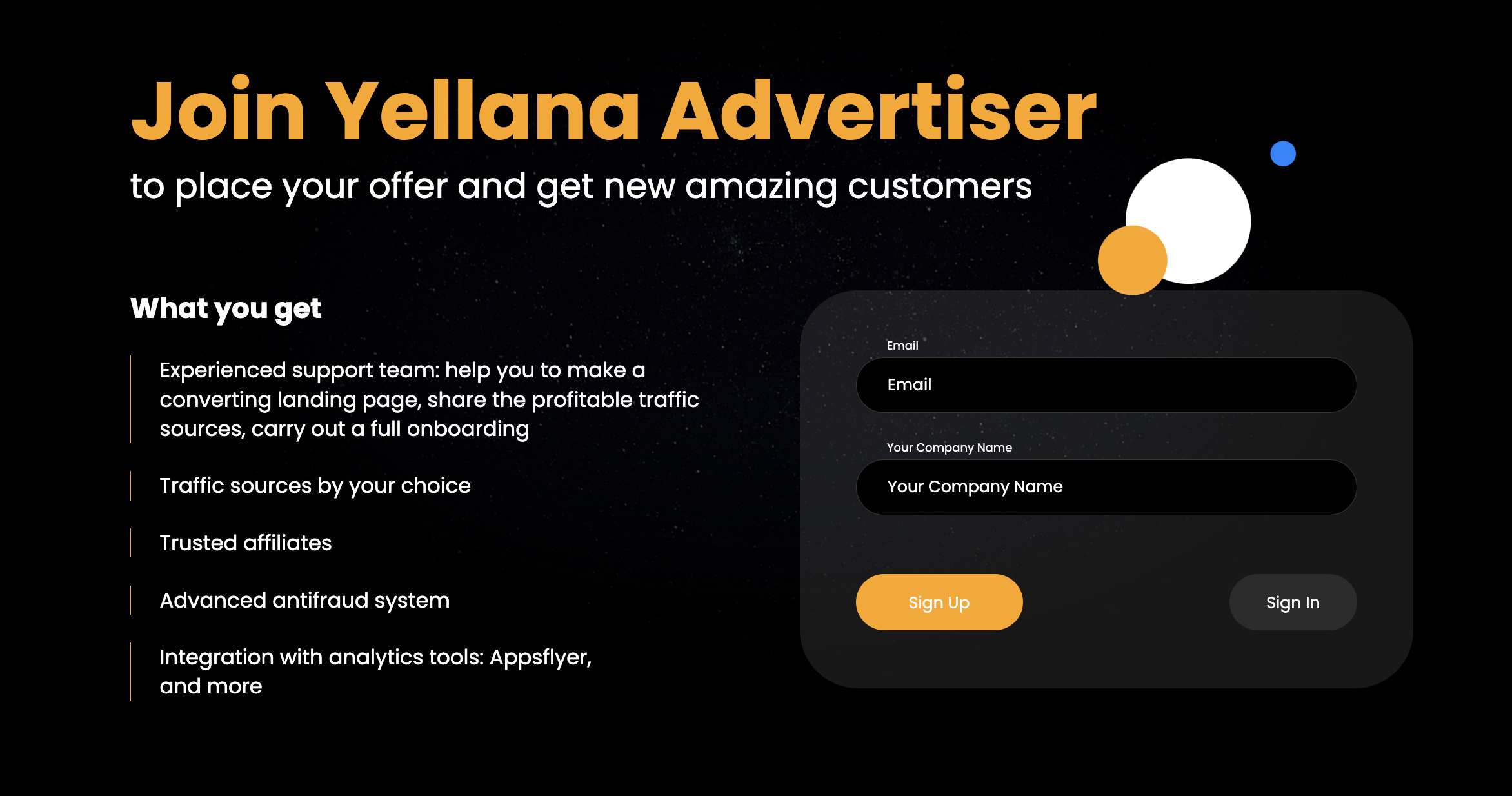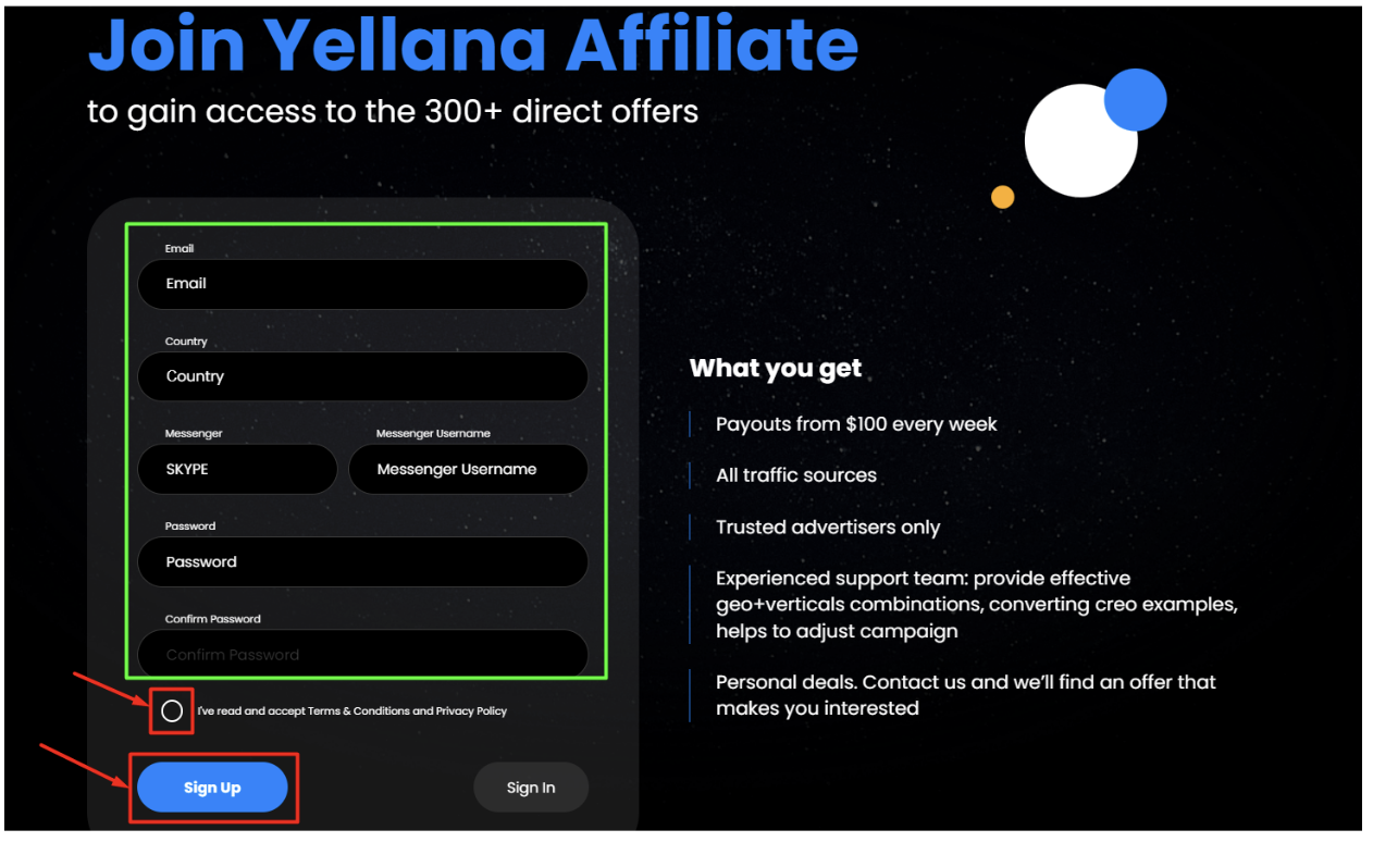 Yellana provides exclusive rates and leads payout models for any GEO and traffic source, along with free creatives, working bundles, and campaign setup assistance.