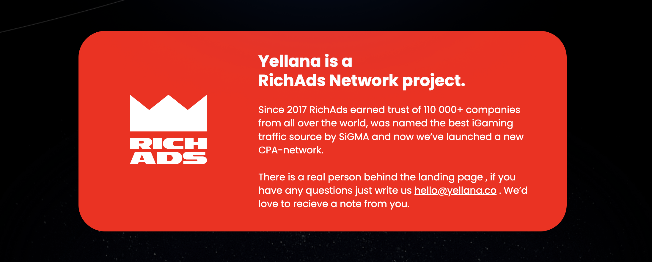 Yellana is owned by Holding Richads Ltd, with Anastasia Titova serving as the Head of the network. The network was created as part of the RichAds ad network holding, which has been operating since 2017.